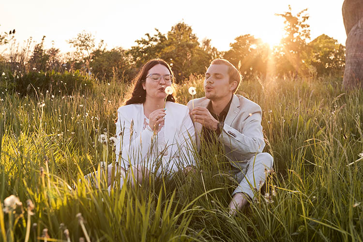 Die Goldene Stunde ist für Paarfotos besonders geeignet. Diese besondere Tageszeit ist kurz vor dem Sonnenuntergang. Die tiefstehende Sonne und das warme Sonnenlicht bilden ein zauberhaftes Licht. Die Schatten werden länger und weicher und sind somit deutlich gefälliger als zur Mittagszeit.